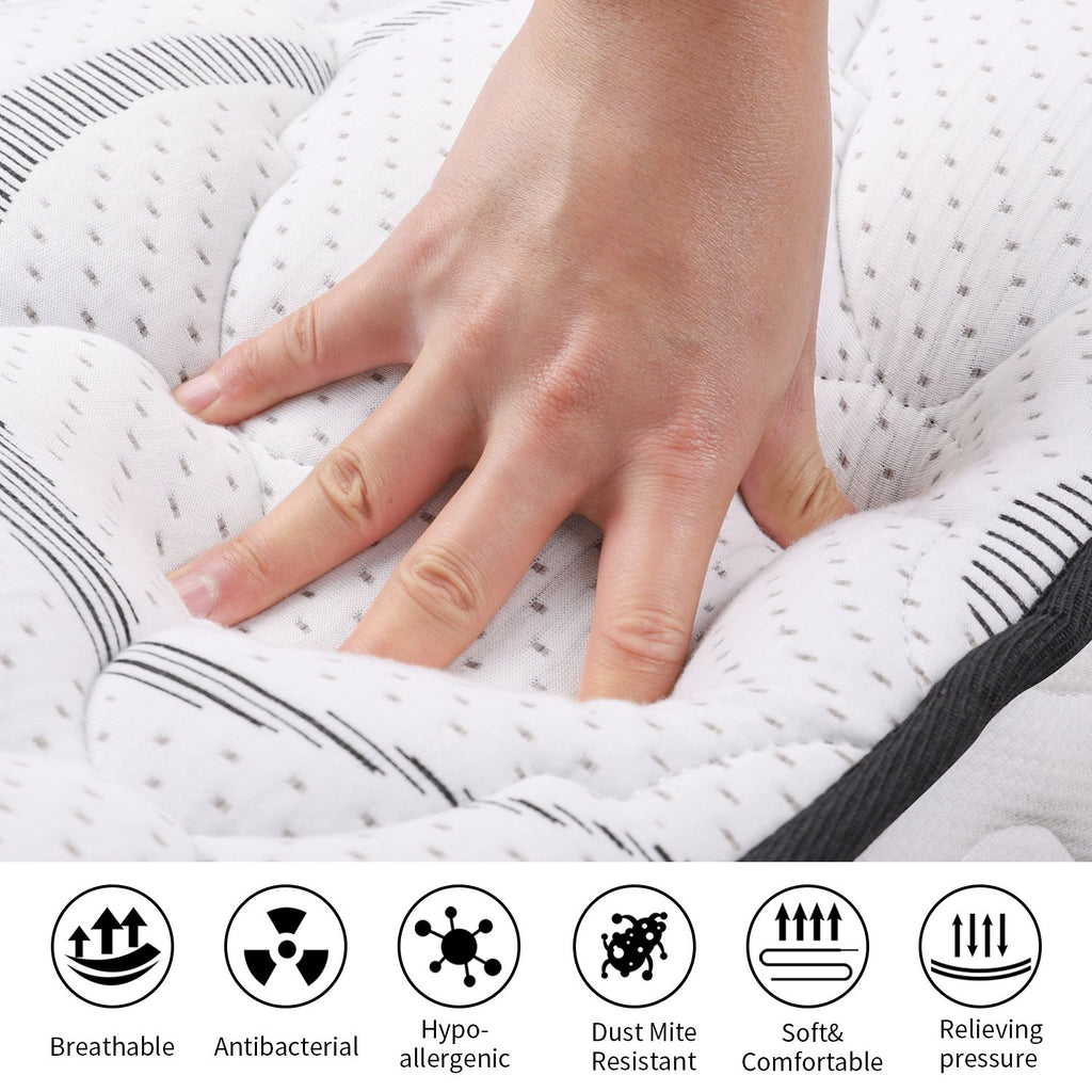 5.3D flower pattern design and 5-layer foam on the upper section to add comfort and looks fashionable, superb, and firm sewing makes it durable, anti-collision corner, and fireproof cotton to ensure safety. The springs that 14cm around the mattress edge strengthened hardness to provide better support prevent the mattress edge from collapse and deformation when sitting on it, and increase the usable area of the mattress.