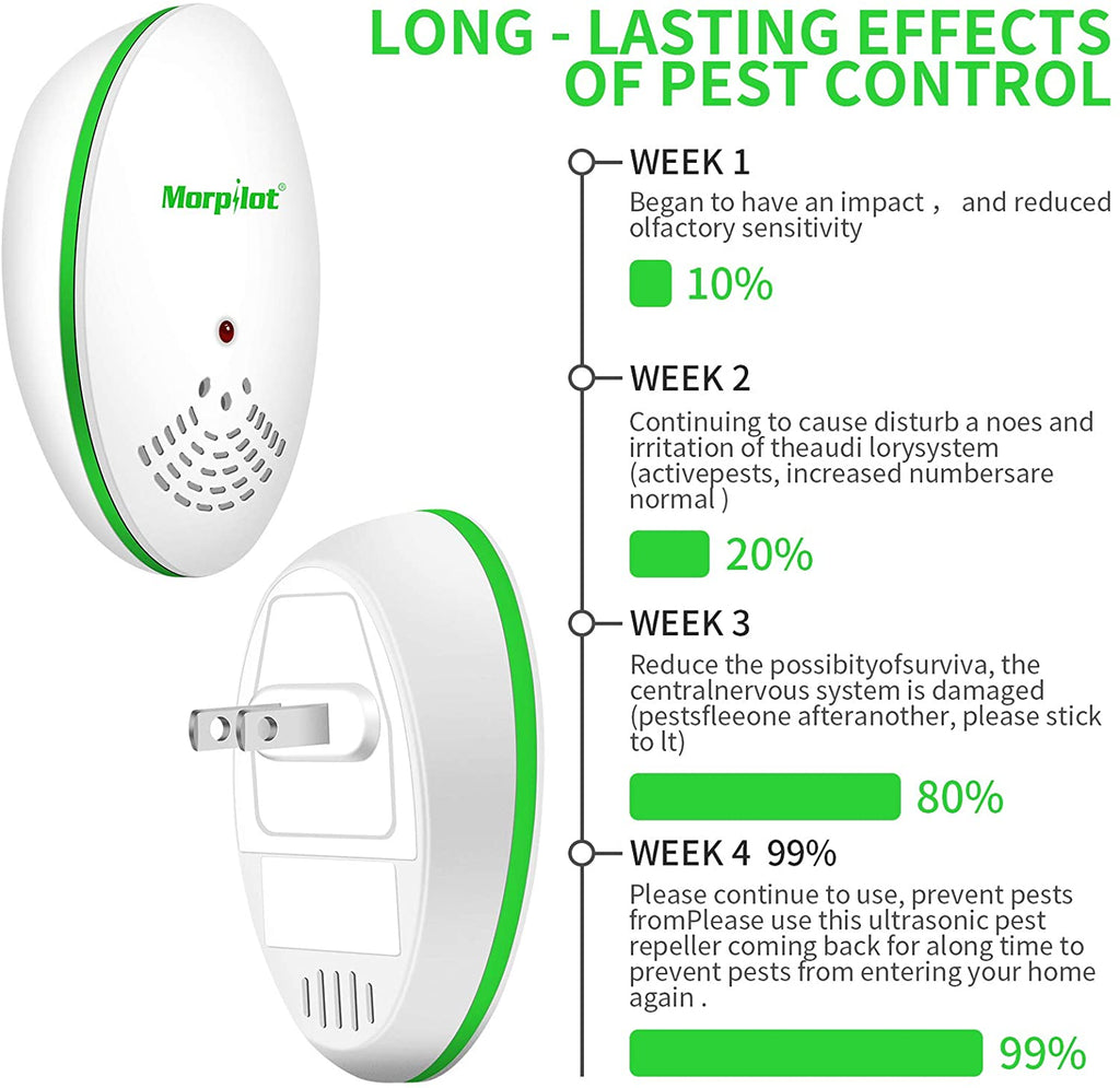 - [Quiet And Effective]: The Ultrasonic Pest Repeller working with low-frequency ultrasound waves, no noise in the room can influence you and your pets. Most customers can see the results within 3-4 weeks! Then we can say goodbye to pests and mice! If you have any problems, please feel free to contact us.Professional technicians are at your service 24 hours. We hope you sleep comfortably and have a pest-free environment.