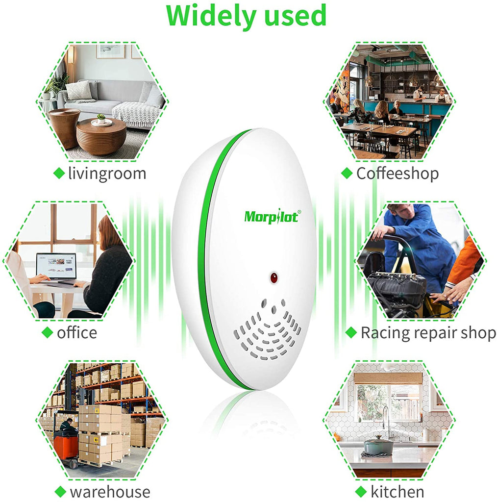 - [Large Coverage Area]: Ultrasonic Pest Repeller is effective in an indoor area up to 8,00 sq. ft. They are widely used in homes, offices, warehouses, gardens, hotels, etc. We recommend you to install one for each room as the ultrasound cannot penetrate walls or solid objects. Please make sure there are no barriers like curtains or cabinets covering in front of the repellent. Please use multiple units for areas where pests are more common.