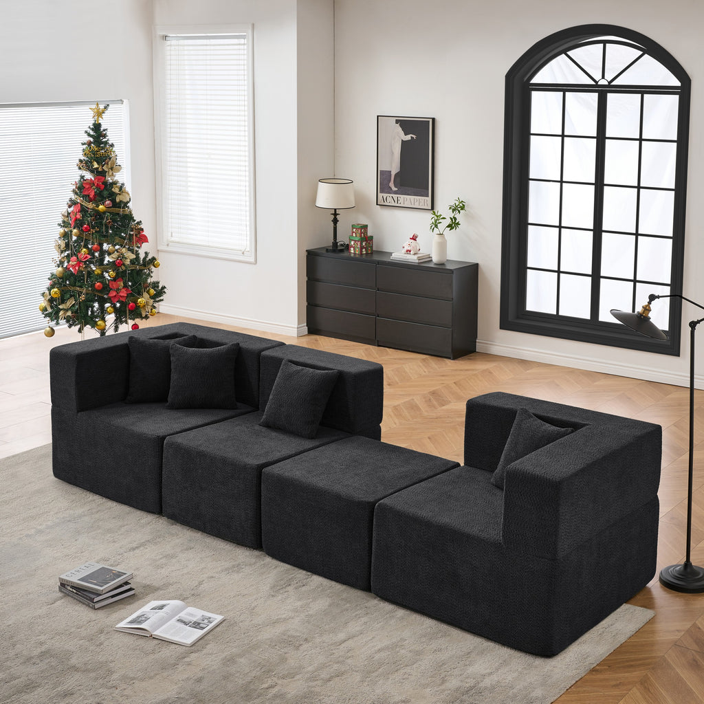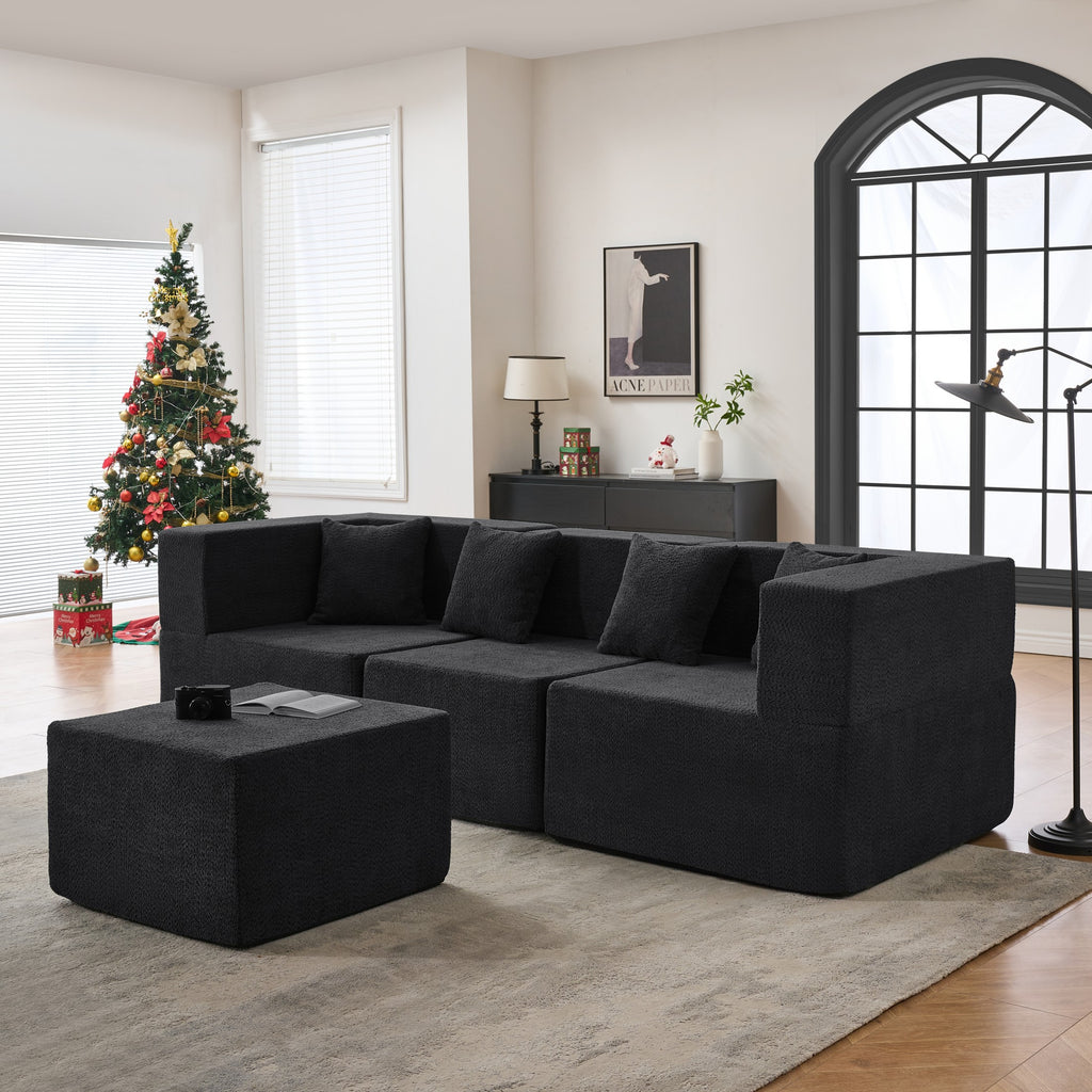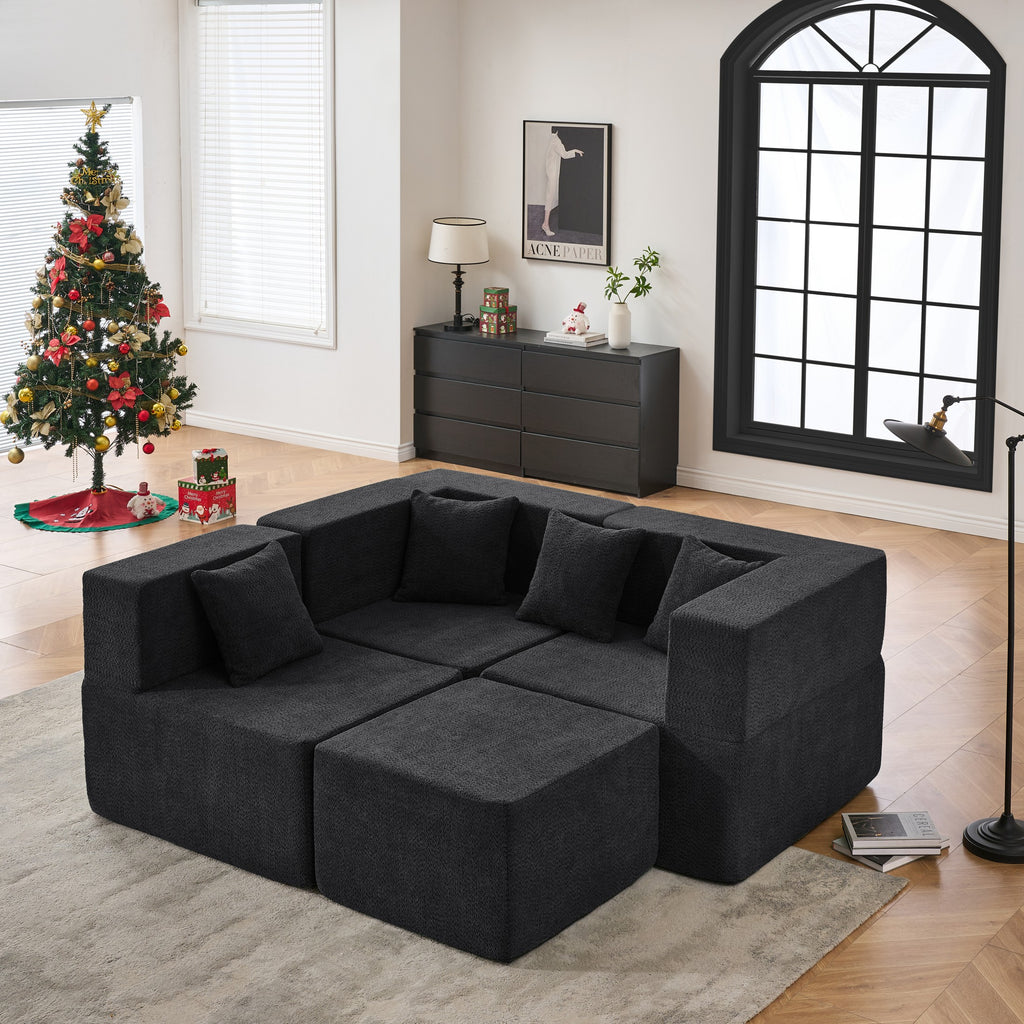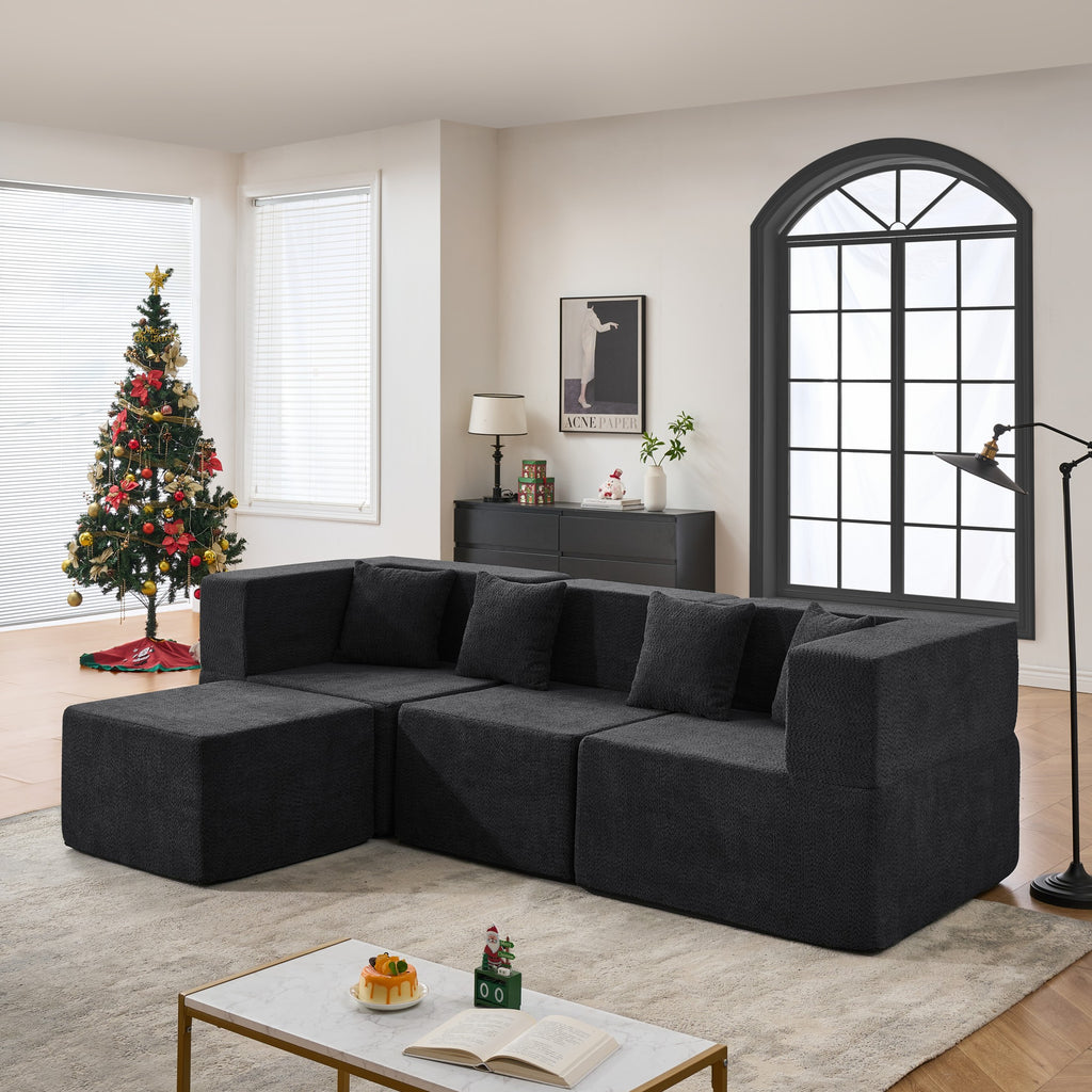 102.5" L-Shaped Cloud Couch Modular Sectional Sofa for Living Room, Black Boucle Fabric Sofa Couch with Ottoman and 4 Pillows, No Assembly