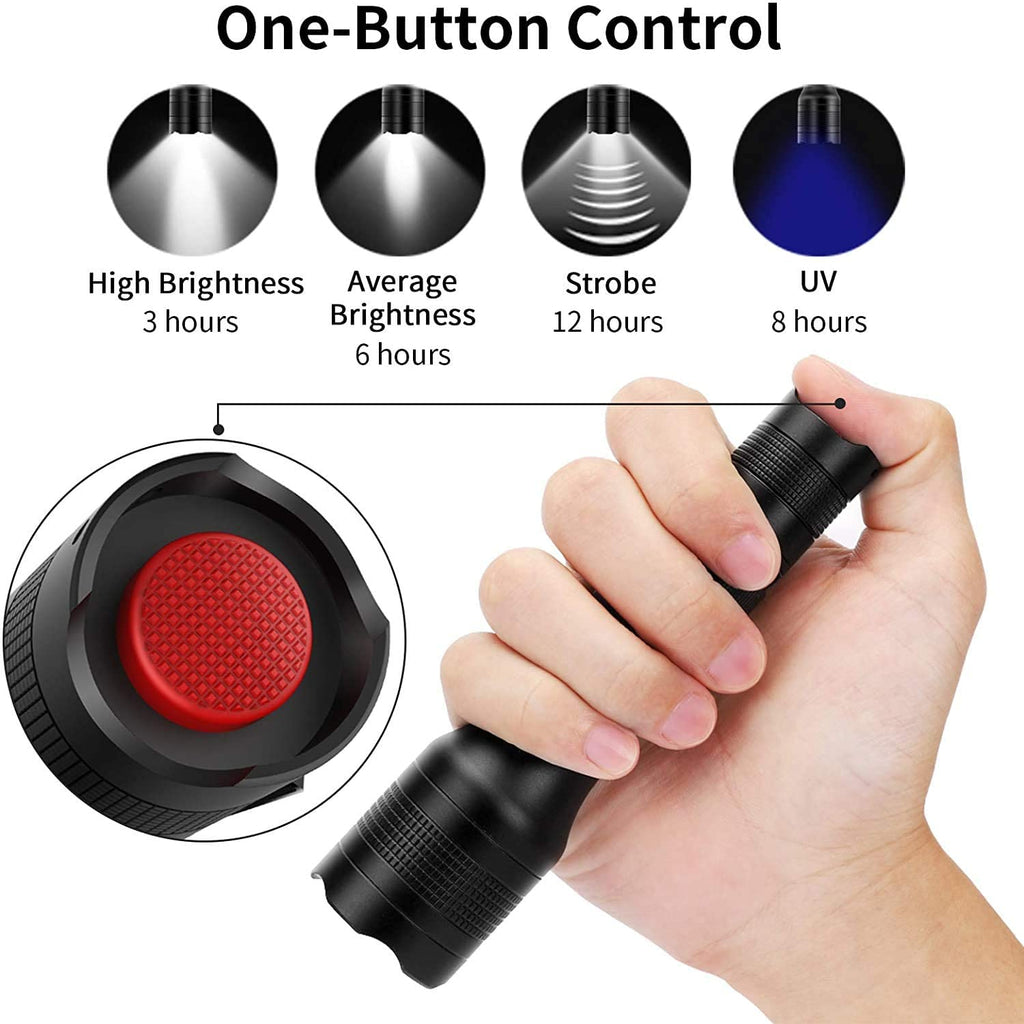 - ❤2 IN 1 & 4 MODES & USB CHARGING- Our flashlight is with white light and UV Light; The 4 modes are high brightness, normal brightness, strobe and UV; The flashlight is made from aviation aluminum, and its weight is 180g, which makes it easy to carry; Supplied with 18650 battery and USB charging cable, which makes charging very easy