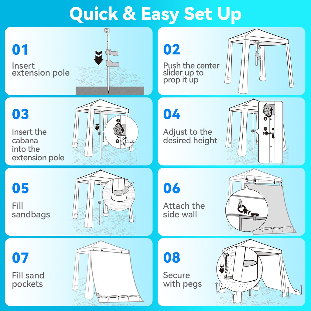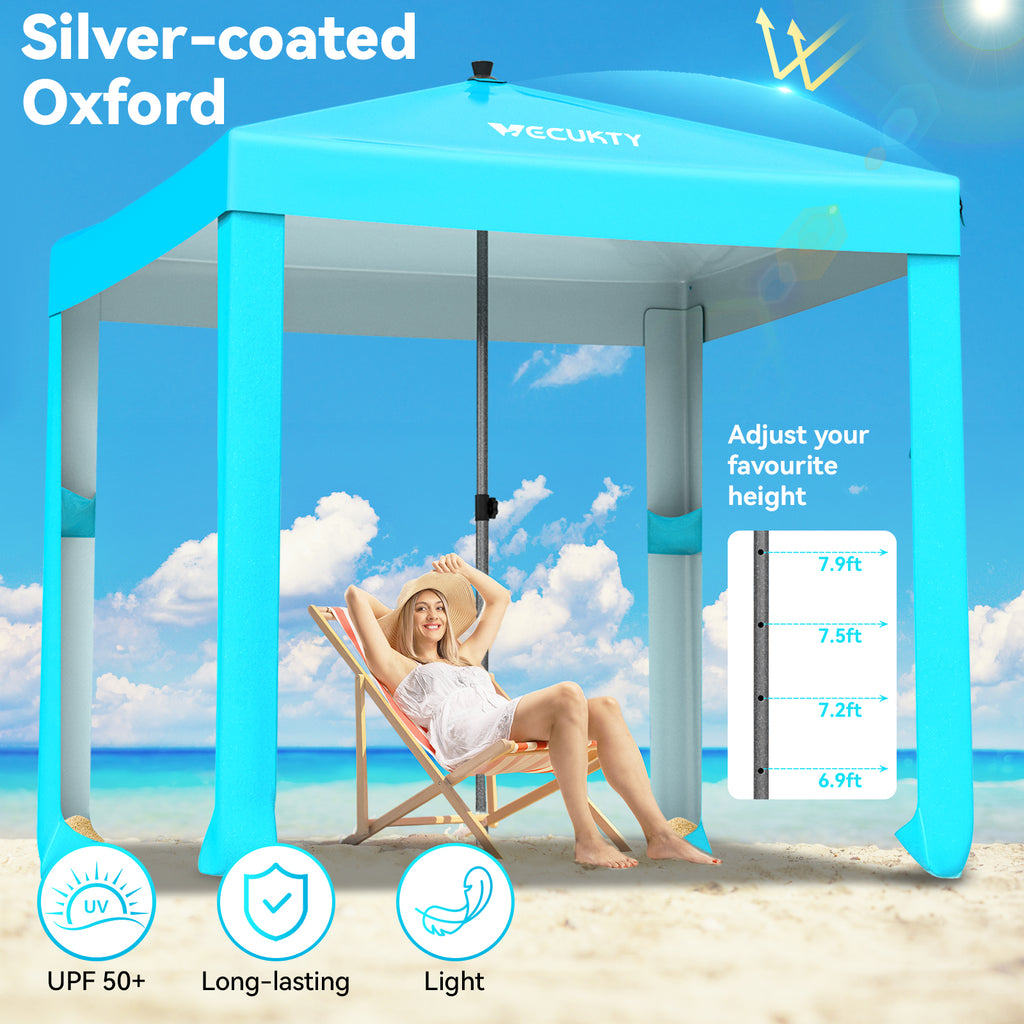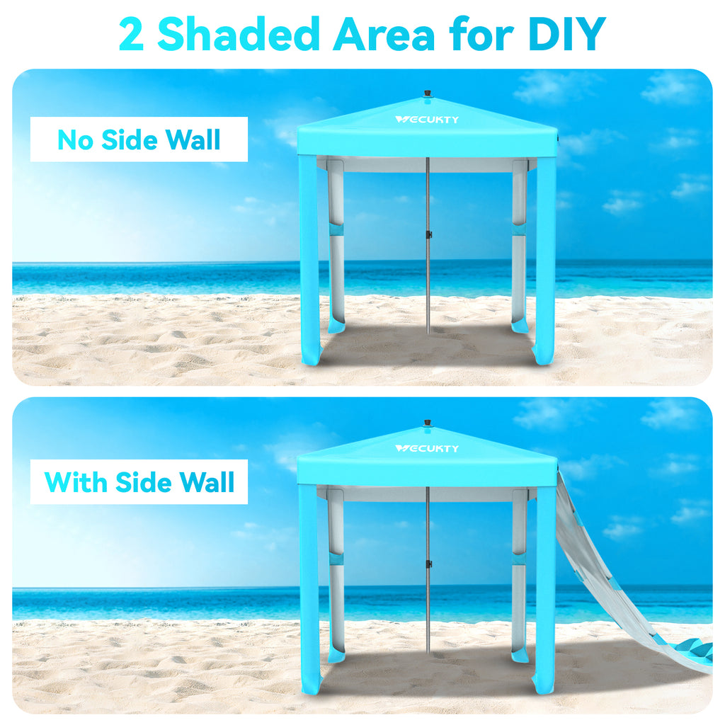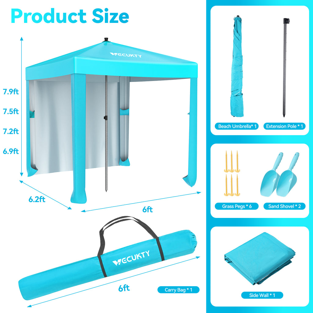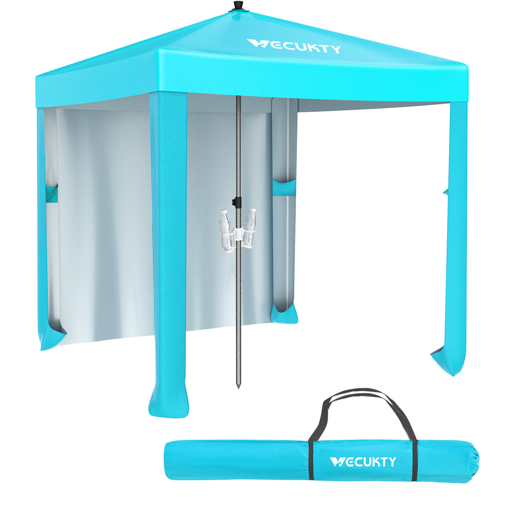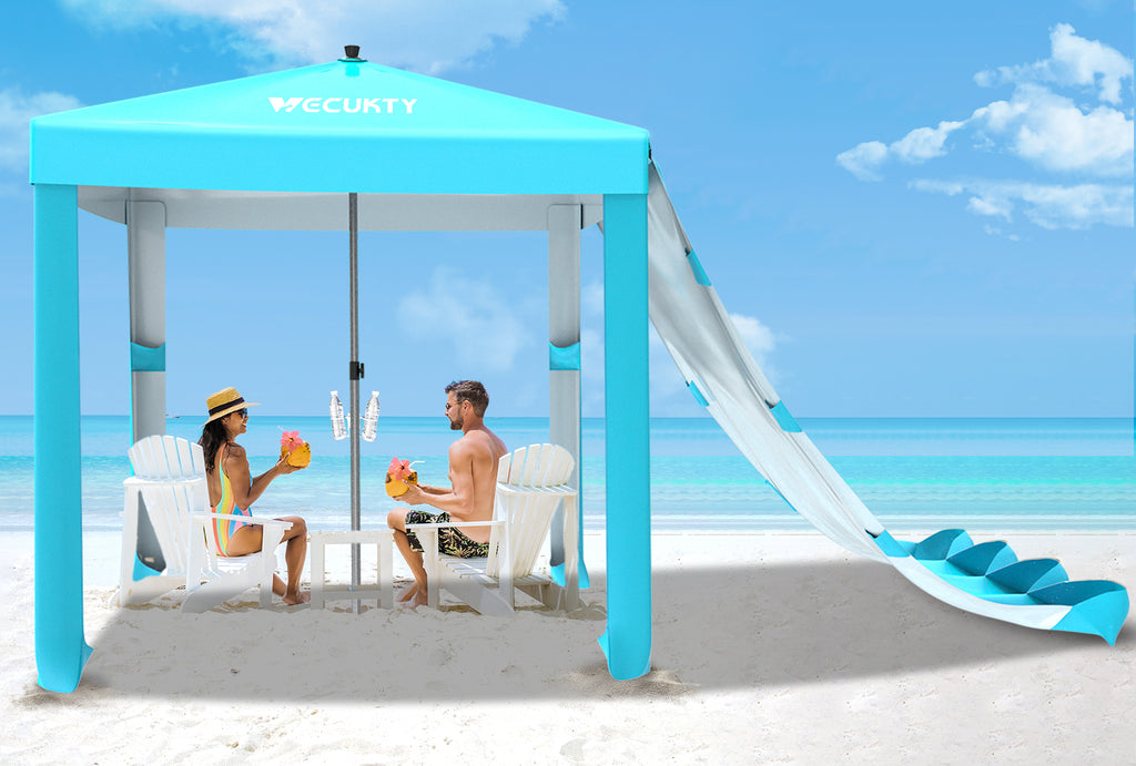 ☂ New for summer 2024, Vecukty air-vented 6.2ft*6.2ft cabana comes in four bright colors. It is made out of high quality, UPF 50+ UV protection, waterproof fabric as the rest of the cabana.