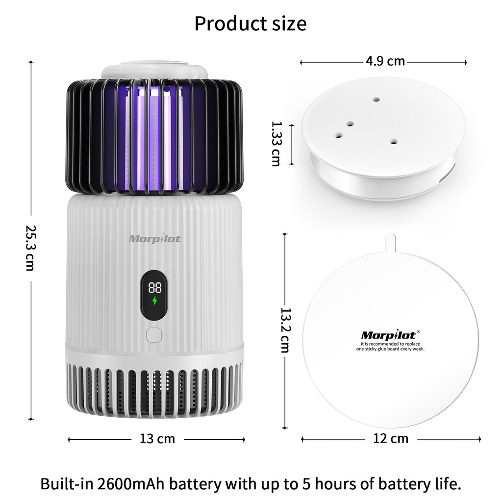 【Double Temptation Triple Extermination】: Morpilot Trap is equipped with (UV lure mosquito lamp) and (bionic lure mosquito agent), 390NM UV lamp to lure a variety of mosquito insects, bionic lure mosquito agent simulates human breath to enhance the effect of luring mosquitoes. 2000V high-voltage power grid, 24 decibels quiet inhalation fan, strong adhesive plate, so that mosquitoes have nowhere to run, and face death.