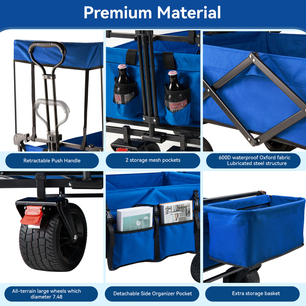 Premium Steel Frame: Our collapsible wagon has a high-strength steel frame with removable 600D oxford PE fabric, which means it can load anything you want for an outdoor picnic. Moreover, the detachable awning can put away your worries about the weather.