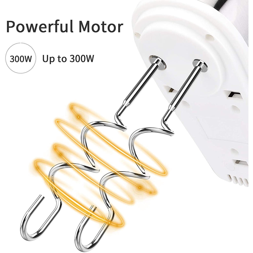 1* whisk, 2* beaters, 2*dough hooks. 2021 The newly upgraded all-pure copper motor has an ultra-high power of 300w, which effectively improves the stirring speed solves many problems for your kitchen, such as whipping cream, mixing eggs, beating the dough for biscuits, cakes, pizzas, etc. - 【ONE-BUTTON POP-UP & VERTICAL DESIGN】: Operational design suitable for beginners and meets all functional needs of professional bakers. You can quickly pop up the attachments with one click. Turbo boost and Automatic Speed design can speed up each gear at the same time. Put it vertically on the table - Anti-dumping design. Portable design to take it to any place.