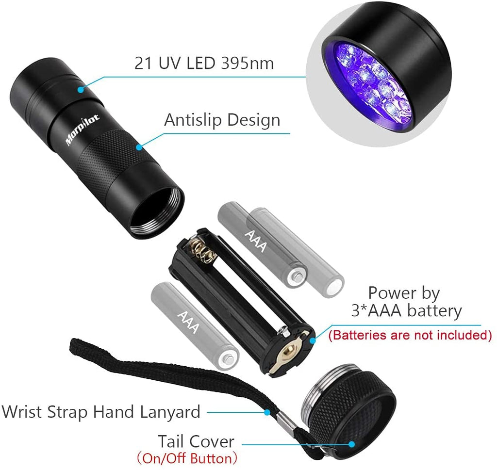 【PRACTICAL】▶ Morpilot blacklight flashlights are helped detect food stains and pet urine stains on carpets, and clothes that are otherwise invisible to the Naked Eye. Suitable to look for scorpions. Easily authenticate currency, driver's license, official identification cards, passports. Hotel room, Antique, or gas leak Inspection