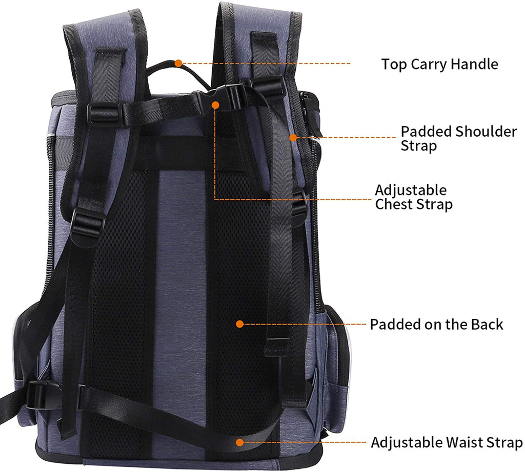 Features:Durable & Portable & Large Capacity: This dog backpack carrier is eco-friendly polyester, wear-resistant and scratch-resistant, lightweight, and easy to carry. With roomy space: 13*11*16.5 inches. Recommend for pets up to 15lbs (Please measure the size and weight of your pet before purchasing this product). You are providing the maximum convenience and comfort for your pet while hiking, traveling, camping.Comfortable Ventilation Design: This cat backpack adopts a four-sided ventilation mesh setting, which ensures the circulation of air in the pet backpack and allows the pet to observe the surrounding environment, thereby making the pet more comfortable and less anxious. The top of the pet backpack can be kept open to allow pets to stick out of the head; the sunshade can be folded and pasted to improve ventilation or can be placed typically to prevent sun exposure.Adjustable Shoulder Straps & Chest Strap & Waist Strap: The widened mesh shoulder straps are adjustable and comfortable for breathability. Ergonomic design, adjustable chest strap, and the elastic waist strap design can help reduce load and increase comfort so that the shoulders are evenly stressed and reduce backpressure. To use the pet backpack more comfortably, it is recommended to adjust the shoulder/chest/waist strap to the most relaxed state before use.Safety Design: The built-in safety strap can prevent the pet from escaping from the inside when opening the top, ensuring the pet's safety. The top, bottom, and front zippers have a lockable function to ensure that your pet cannot open the door by itself, providing double protection. With the sturdy and comfortable bottom cushion with double-sided use, you can choose the side that your pet prefers. It can be removed and washed separately!More Convenient & More Intimate: Pockets on both sides of the pet bag provide more room for storage. You can store folding dog bowls, snacks, toys, garbage bags, etc. In addition, this pet travel backpack is also equipped with a blue foldable dog bowl.