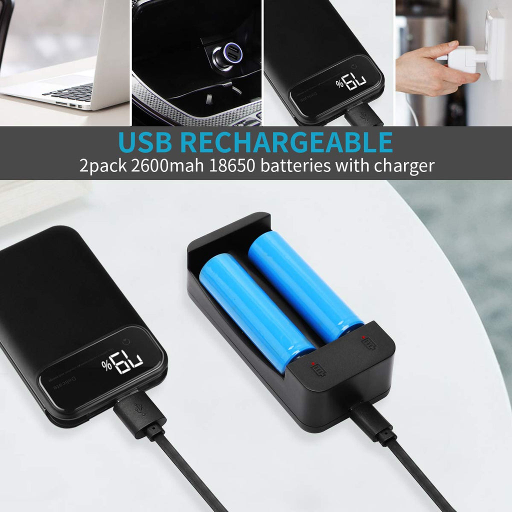 USB RECHARGEABLE HEADLIGHT - The front light is USB Rechargeable. We not only provide the rechargeable 18650 battery, but also a free charger. It charges from your computer or any device with a USB port. Save your money and hassle.