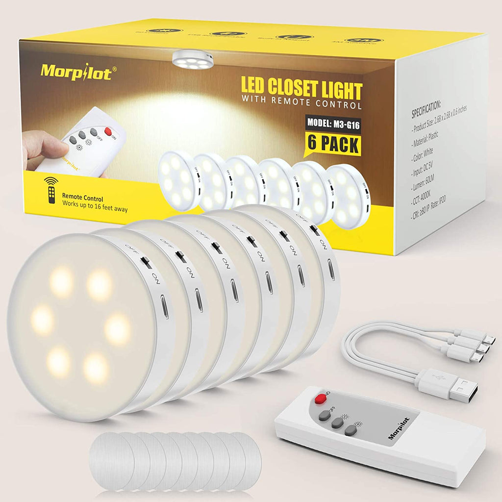 Morpilot Puck Lights, Rechargeable Under Cabinet Lighting, Dimmable Closet Lights Battery Powered, Led Cabinet Light with Wireless Remote, Under Counter Light for Kitchen, Stick on Lights (6 Packs)