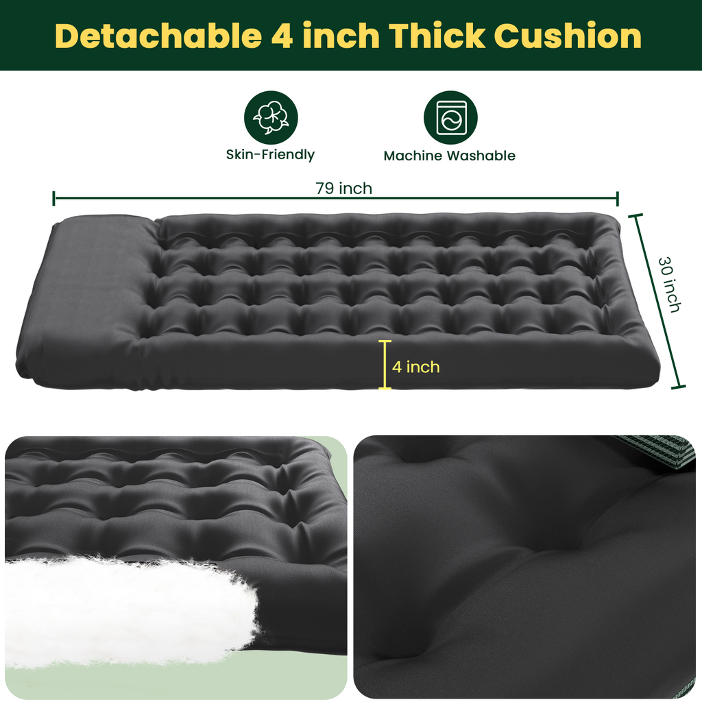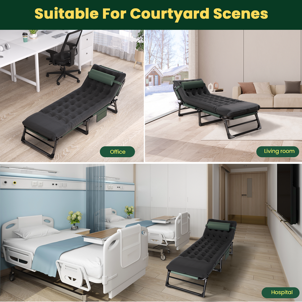 | 🏕️【VECUKTY 3-in-1 XXL 29.5in Folding Camping Cot】 This folding bed combines the functions of lying, sleeping and sitting in one. During the day, it can be used as a comfortable chair, suitable for working, reading or relaxing. At night, it can be easily transformed into a bed, providing a comfortable sleeping place for guests. Compared to buying separate cots, beds and chairs, choosing for a 3-in-1 camping cot could be more cost-effective. 🚘【Durable Upgrade Frame】 Our folding crib bed adopts a full-square tubular frame with support from four legs, one more than typical beds of its kind. The U-shaped support legs distribute pressure evenly, with an inner wall thickness of 1mm. The material is durable and the design enhances stability, providing strong support with a weight capacity of up to 550 pounds. ⛺【4-Position Adjustable Backrest】 Folding cot beds are usually designed for exceptional comfort, providing a pleasant sitting and sleeping experience. The backrest can be adjusted to 4 different positions, ensuring optimal comfort and support. Equipped with soft cushions and pillows, the cushions weigh 4.44 lbs and have a thickness of 4 inches. The Folding Lounge Chair Cot has multiple mattress options. The mattress is a soft, removable pad that is very comfortable, ensuring that users can enjoy a comfortable experience in a variety of use scenarios. 🏔️【Space Saving & Portable】 The 3-in-1 Camping Cot Chair is a versatile piece of furniture suitable for compact living spaces, such as small apartments, bedrooms or studies. It can transform into a bed, chair, or recliner as needed, saving a significant amount of space. With its triple storage design, it folds down to a small thickness. It comes with a 600*600D Oxford cloth storage bag, making transportation and storage convenient. 🏝️【Adaptable to Different Needs】 Adult camp beds boast a modern or stylish look and design, adding a touch of distinctive decor to indoor spaces. Whether to meet the changing needs of family members or unexpected guests, it effortlessly meets seating and sleeping needs in different scenarios. It is also an excellent choice for relaxing on road trips, by the pool, by the lake, in RVs, at campgrounds, on patios, decks, in tents or cabins. 💺【Folding Camping Cot】 Full Flat Folding Bed Dimensions: 79 inches x 29.5 inches x 11 inches. Folding Chair Dimensions: 30.5 inches x 30.31 inches x 6.3 inches. Folding bed weight: 23.14 pounds; 💡Note:The cushion is vacuum packed. Please leave it for a period of time after unpacking so that the cotton cushion can be fully fluffy. |